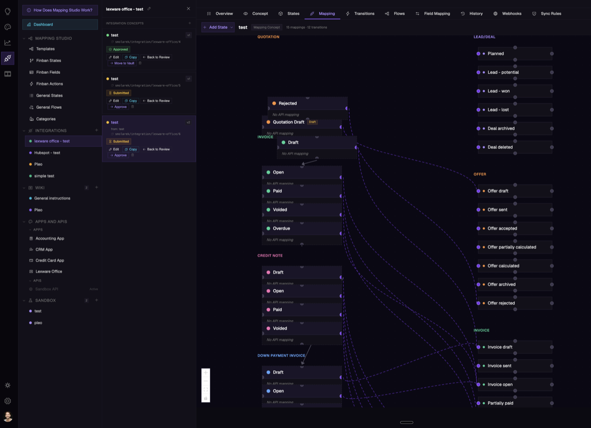 Lexoffice strukturiert Rechnungen anders als sevDesk. DATEV hat eigene Felder, Stripe eigene Webhook-Events. Mapping Studio loest dieses Problem auf einer hoeheren Abstraktionsebene: Entwickler konfigurieren visuell, wie Daten transformiert werden. Die Konfiguration wird als JSON exportiert und zur Laufzeit interpretiert.
