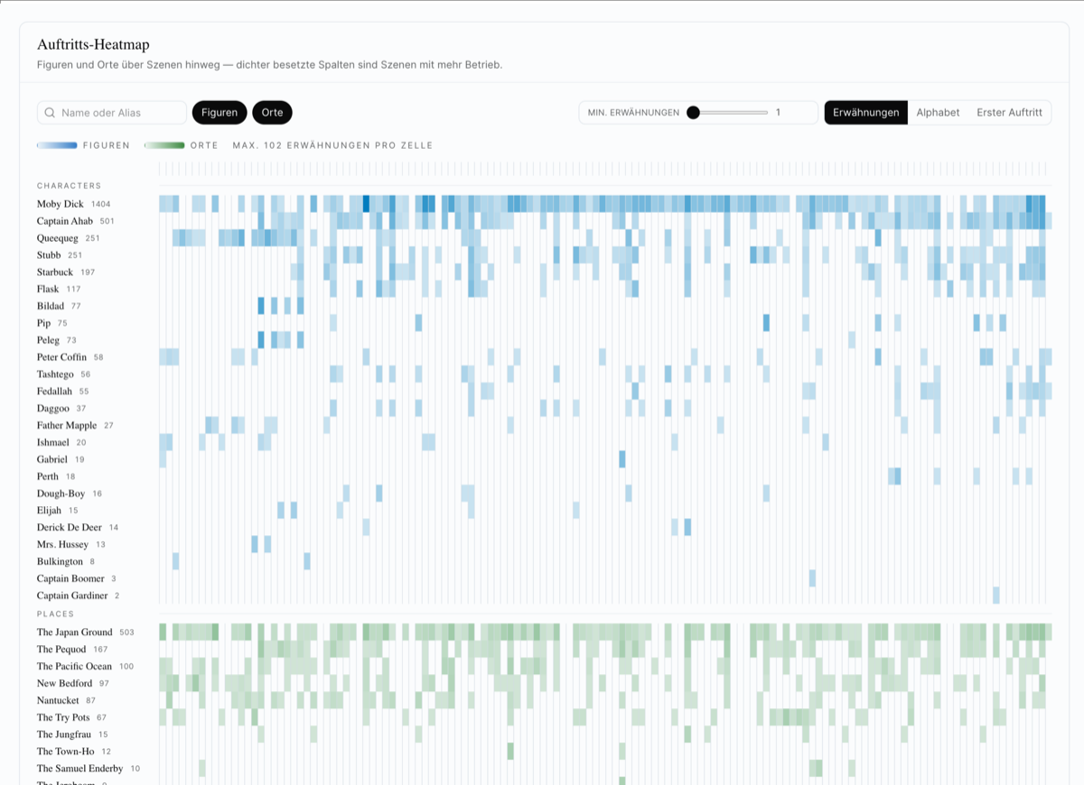 Pacing-Kurven, POV-Verteilung, Wortzahl-Heatmaps — das Manuskript als analysierbare Datenstruktur.